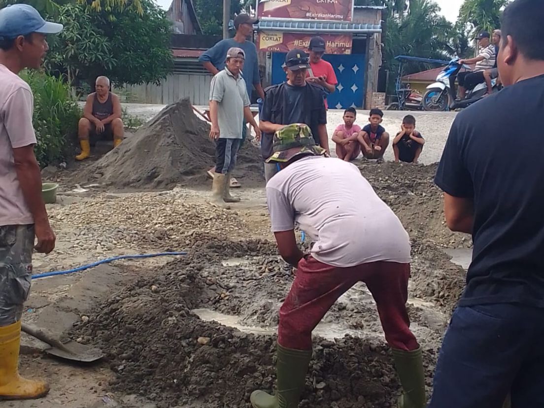 Di lokasi pengerjaan, suasana gotong royong sangat terasa. Drum biru dijadikan wadah adukan semen, karung-karung Semen Merah Putih disusun di sisi jalan, sementara para pria bertugas mengecor lobang yang dianggap paling berbahaya.