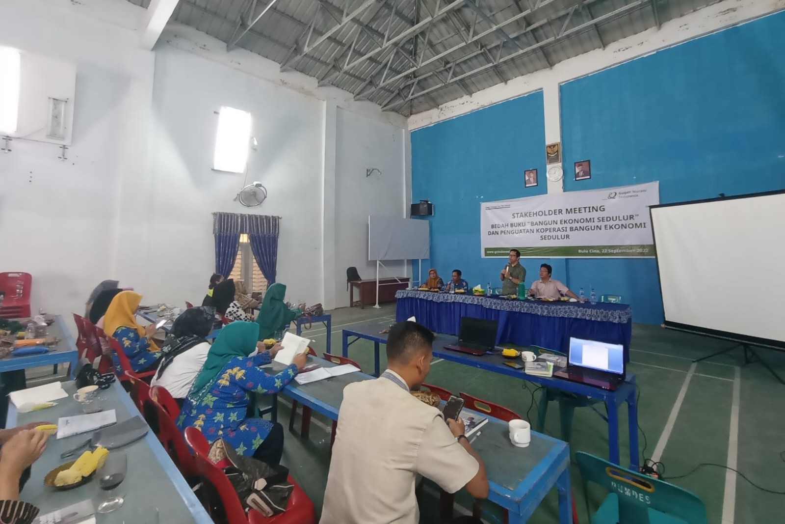 Project Manager GNI, Anwar Suhut dan penulis buku memaparkan materinya dalam bedah buku Bangun Ekonomi Sedulur di Aula Kantor Desa Bulu Cina, Kamis (22/9). Selain membedah, diskusi ini juga dirangkai dengan peluncuran buku “Bangun Ekonomi Sedulur”.