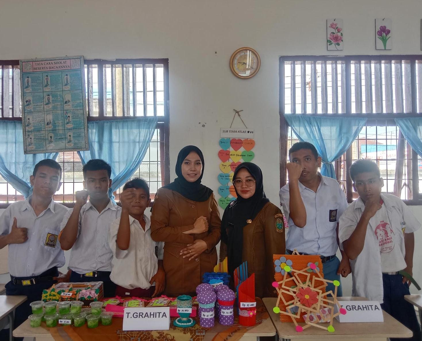 Peserta pameran menyajikan beragam karya, mulai dari tempat tisu, tempat jarum, tempat pensil, hiasan dinding, figura foto, hingga bunga dari barang bekas. Sementara para orangtua juga turut berkontribusi dengan menampilkan karya kuliner seperti aneka puding, martabak mini, keripik ubi, dan peyek kacang.