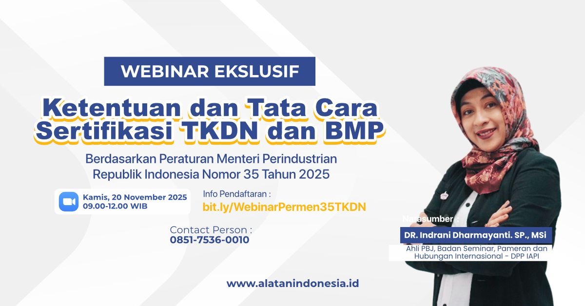 Menjawab kebutuhan tersebut, Alatan Indonesia — lembaga pelatihan dan konsultan bisnis pemerintahan terkemuka — menghadirkan pembahasan komprehensif tentang Peraturan Menteri Perindustrian (Permenperin) Nomor 35 Tahun 2025, yang menjadi penyempurnaan besar dalam tata cara dan sertifikasi TKDN dan BMP.