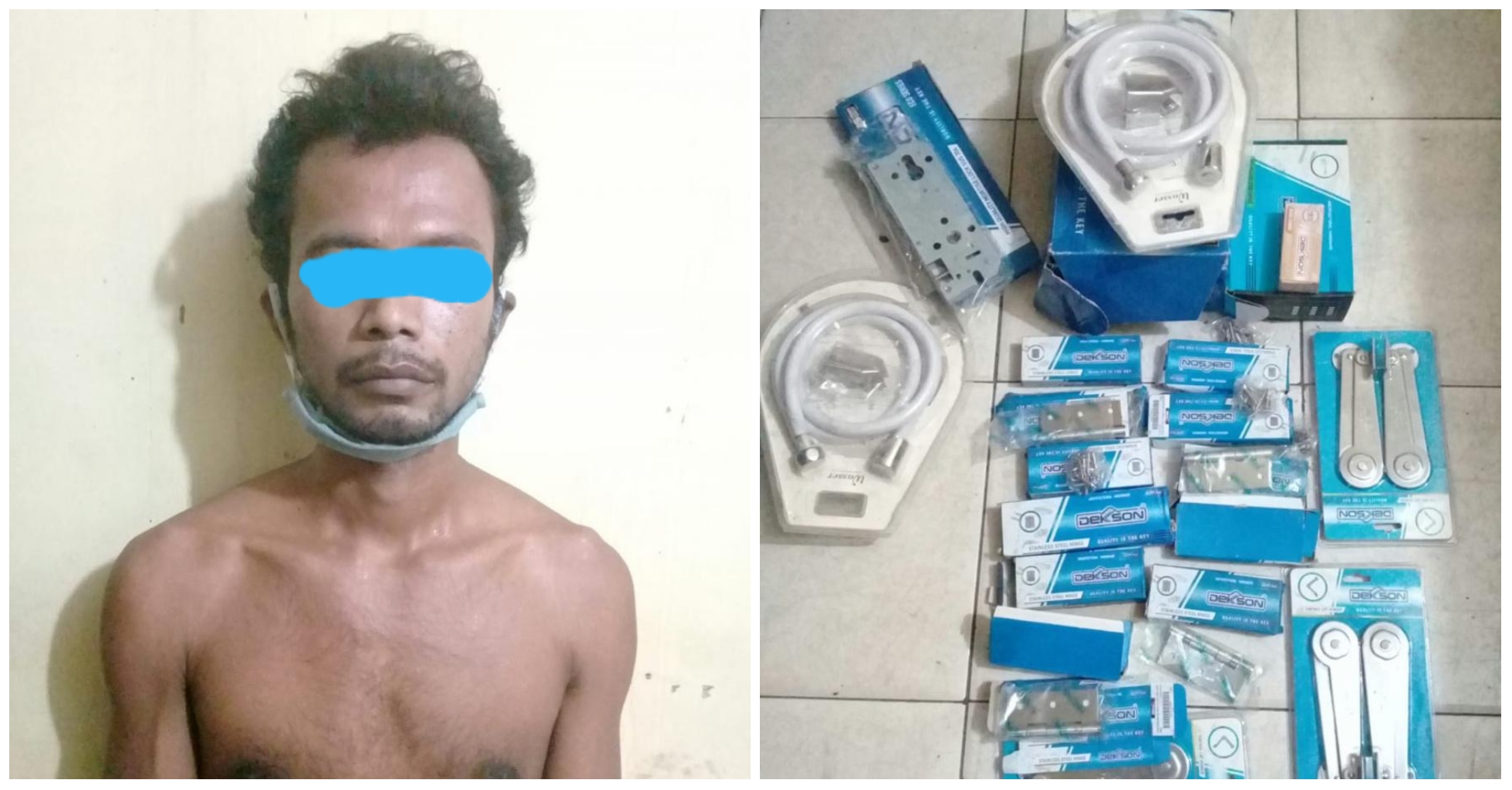 Dari terduga tersangka, petugas turut mengamankan barang bukti perkakas perehapan rumah merek Dexon berupa; 2 buah selang Shower, 12 buah engsel pintu; 3 buah sweeng jendela; 1 buah rumah kunci, serta 2 buah handel kunci.
