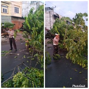 Evakuasi batang pohon oleh personel Unit Lantas Polsek Percut Sei Tuan dipimpin langsung Kanit Lantas, Iptu J Panjaitan.