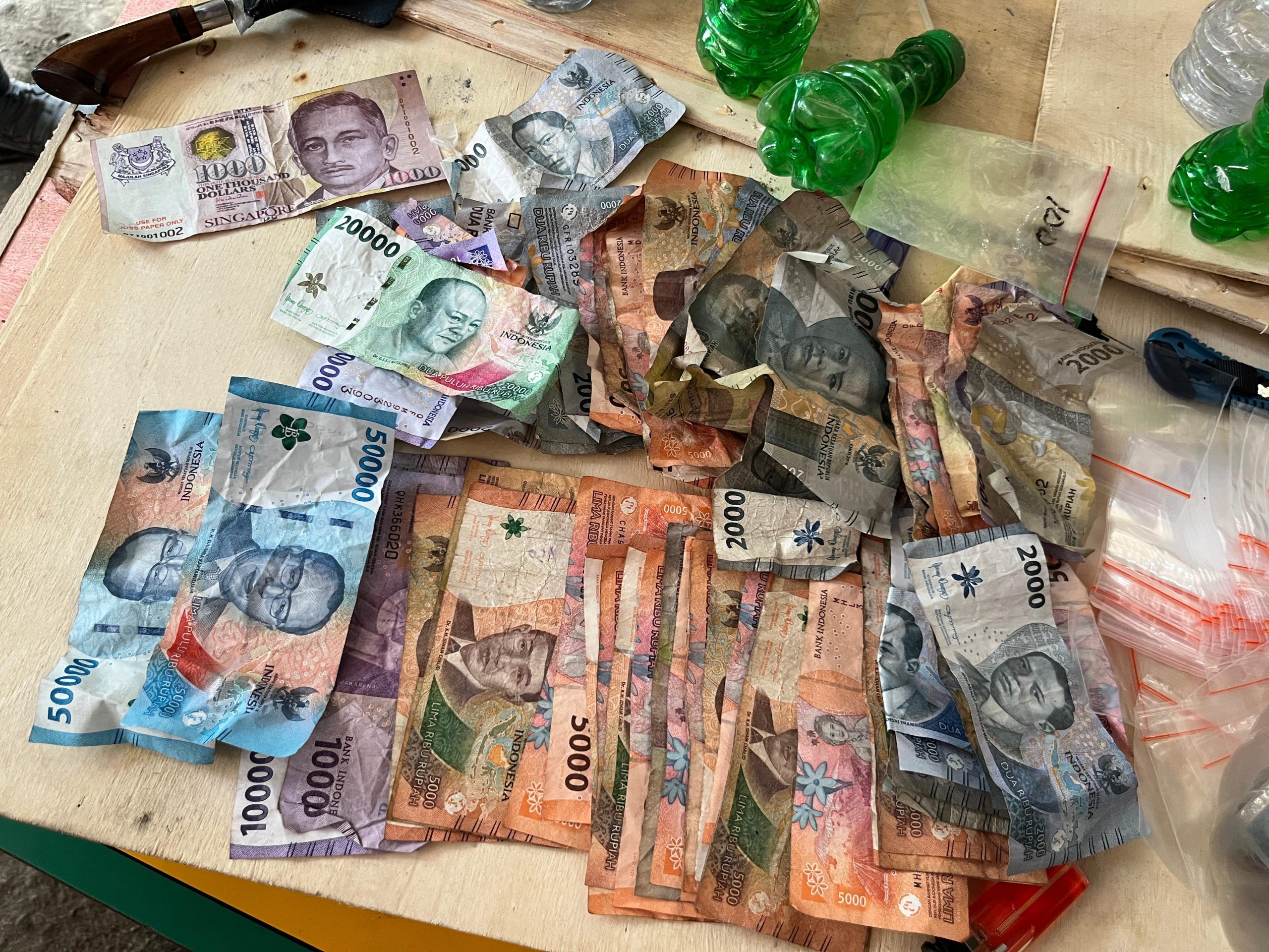 Di sana, tiga pria yakni SD (45), DR (19), dan RS (39) ditangkap berikut barang bukti narkoba dan alat hisap. Selain itu selembar mata uang Singapura bertuliskan 1000 Dollar, juga ditemukan di lokasi penggerebekan, dan sebilah pisau yang diduga sengaja disiapkan untuk menyerang petugas.