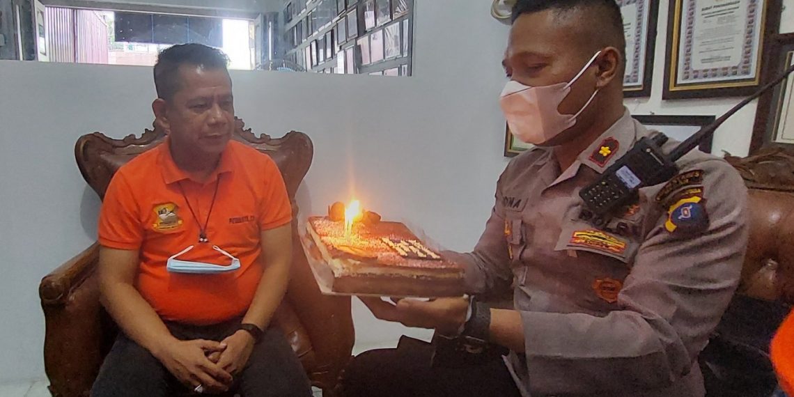 Selanjutnya, Kapolsek dan Kanit Reskrim dipersilahkan masuk ke ruang Ketua Pewarta Polrestabes Medan. Disitu, Kompol Roma menyerahkan kue tar sebagai kue ulang tahun bagi Pewarta Polrestabes Medan di HPN.
