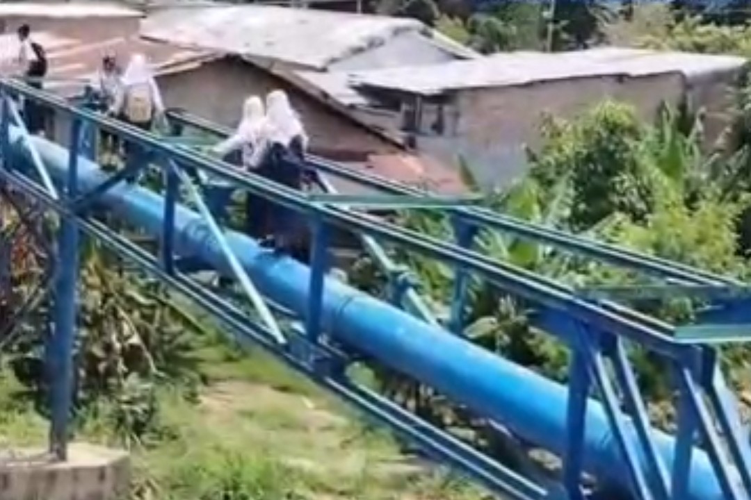 Dalam video yang beredar, para pelajar terlihat berhati-hati melangkah di atas pipa sempit tanpa pengaman. Situasi ini memicu kekhawatiran warga karena risiko terjatuh sangat tinggi, terlebih saat hujan atau kondisi licin.