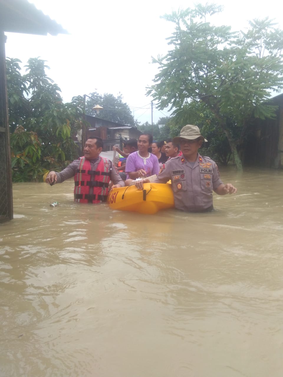 Tanggap informasi banjir di wilkumnya yang diakibatkan curah hujan yang tinggi, Satuan Sabhara Polresta Deli Serdang dengan sigap memberikan pertolongan kepada warga di Desa Tanjung Morawa B, Dusun III, Kecamatan Tanjung Morawa yang terendam banjir akibat hujan selama yang tak berhenti sejak kemarin malam hingga pkl 11.00 wib siang ini. Rabu (29/01/2020).