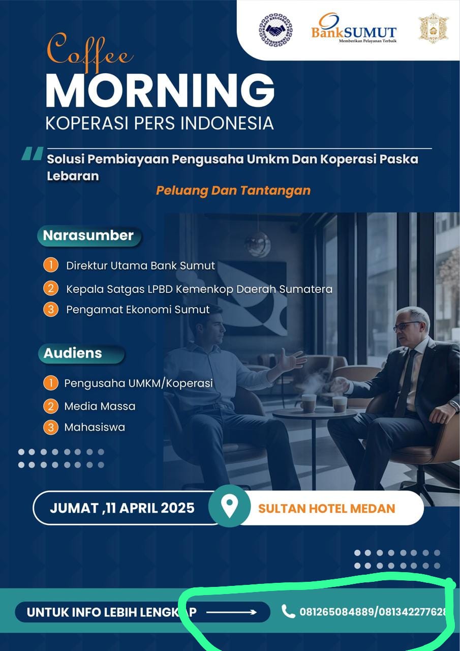 ARMADABERITA.COM | MEDAN – Lebaran sudah usai, waktunya pelaku UMKM dan koperasi kembali tancap gas! Nah, buat kamu yang pengin tahu solusi pembiayaan setelah libur panjang, jangan lewatkan Coffee Morning yang digelar Koperasi Keluarga Pers Indonesia pada Jumat, 11 April 2025, di Hotel Sultan, Jalan Darussalam, Medan.
